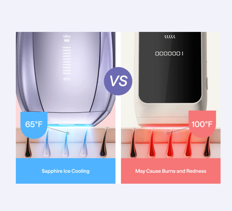 Sapphire Ice Cooling keeps your skin at a safe 65°F, offering a comfortable experience. Compare that to the 100°F heat of other methods, which can cause burns and redness. Choose the cooling solution for a soothing, irritation-free result.